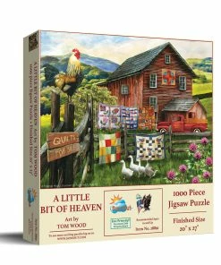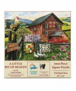 Tom Woodโs A Little Bit of Heaven brings you right into a quilt sale in the country. The brightly colored quilts, rustic barn, and adorable animals will keep you busy while putting together this 1000 piece puzzle from SunsOut. Completed puzzle measures 20โ x 27โ.
