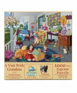 Grandmaβs porch is full of fun and excitement in SunsOutβs A Visit to Grandmaβs. This 1000 piece puzzle features Joseph Burgessβ bright and detailed artwork. From quilting to vintage toys to pets, this puzzle has something for everyone. The completed puzzle will measure 20β x 27β.