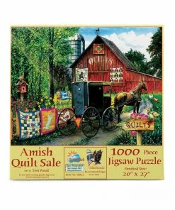 A horse brings a carriage to the quilt sale in this SunsOut puzzle, Artist Tom Wood has illustrated some fun quilts including one with a cat chasing a butterfly. This 1000 piece puzzle will measure 27โ x 20โ when complete.