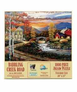 The sun is setting on a crisp fall day in βBabbling Creek Roadβ from SunsOut. A quiet town nestled in the mountains is the focus of this John Zaccheo puzzle. From the bright sky to the fall leaves to the reflections in the water, there are lots of fun elements to piece together! The completed 300 piece puzzle will measure 27β x 20β.Β