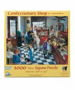 βConfectionary Shopβ from SunsOut features the fun artwork of Susan Brabeau. This nostalgic scene depicts children picking out sweets at the local shop. A dog licks up some spilled ice cream while its owner stares in awe at the display case! The completed 1000 piece puzzle will measure 27β x 20β.