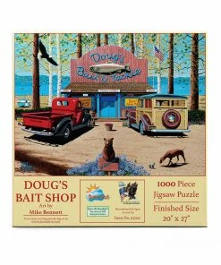 Enjoy a day at the lake with Dougโs Bait Shop. This 1000 piece puzzle takes you lakeside to a small town bait shop with classic cars, a dog, and even a bald eagle. The completed puzzle measures 20โ x 27โ.