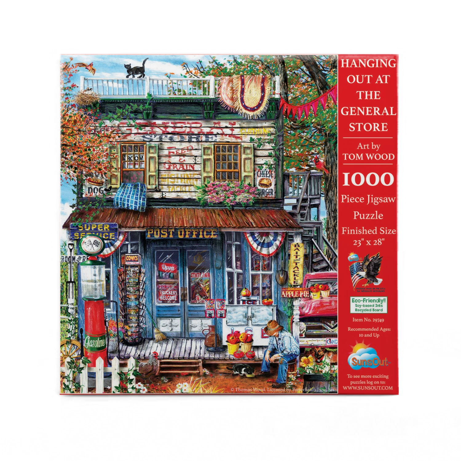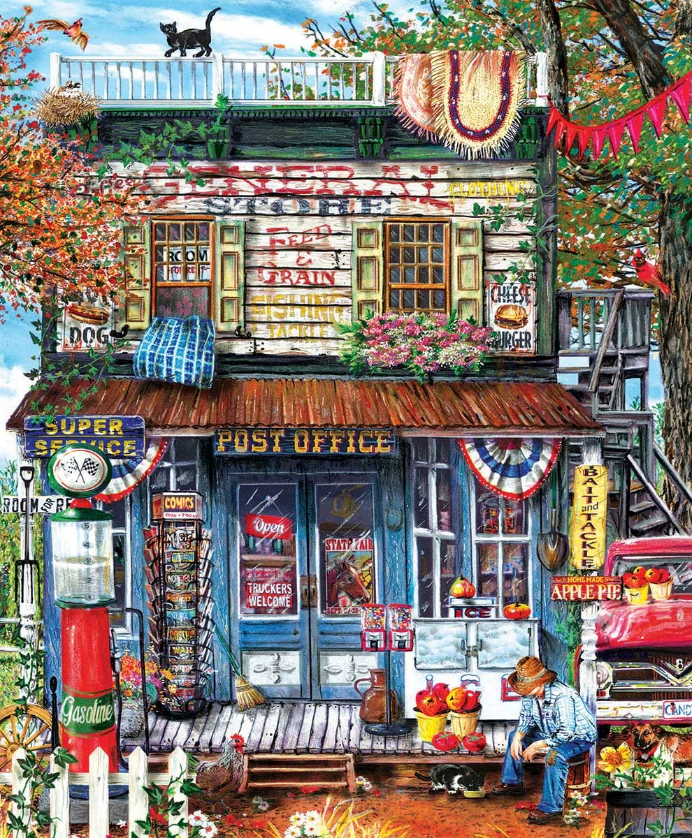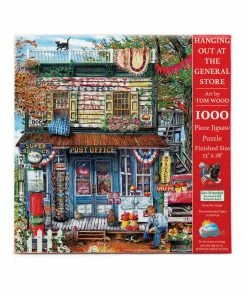 Step back in time with βHanging Out at the General Storeβ from SunsOut. This nostalgic image comes from artist Tom Wood. Complete with comic books, a gas pump, and snacks, this store is full of everything you might need on a road trip! The completed 1000 piece puzzle will measure 23β x 28β.
