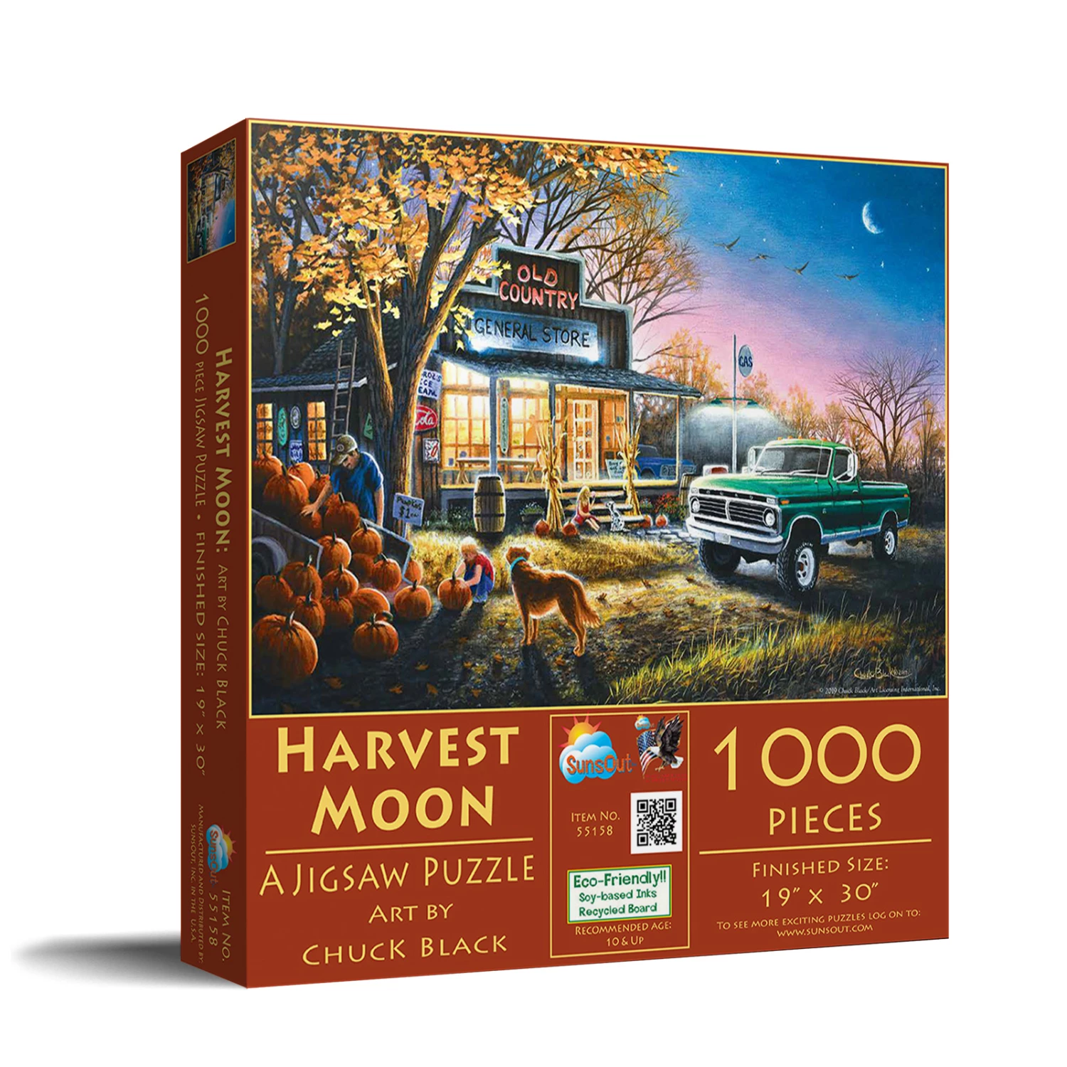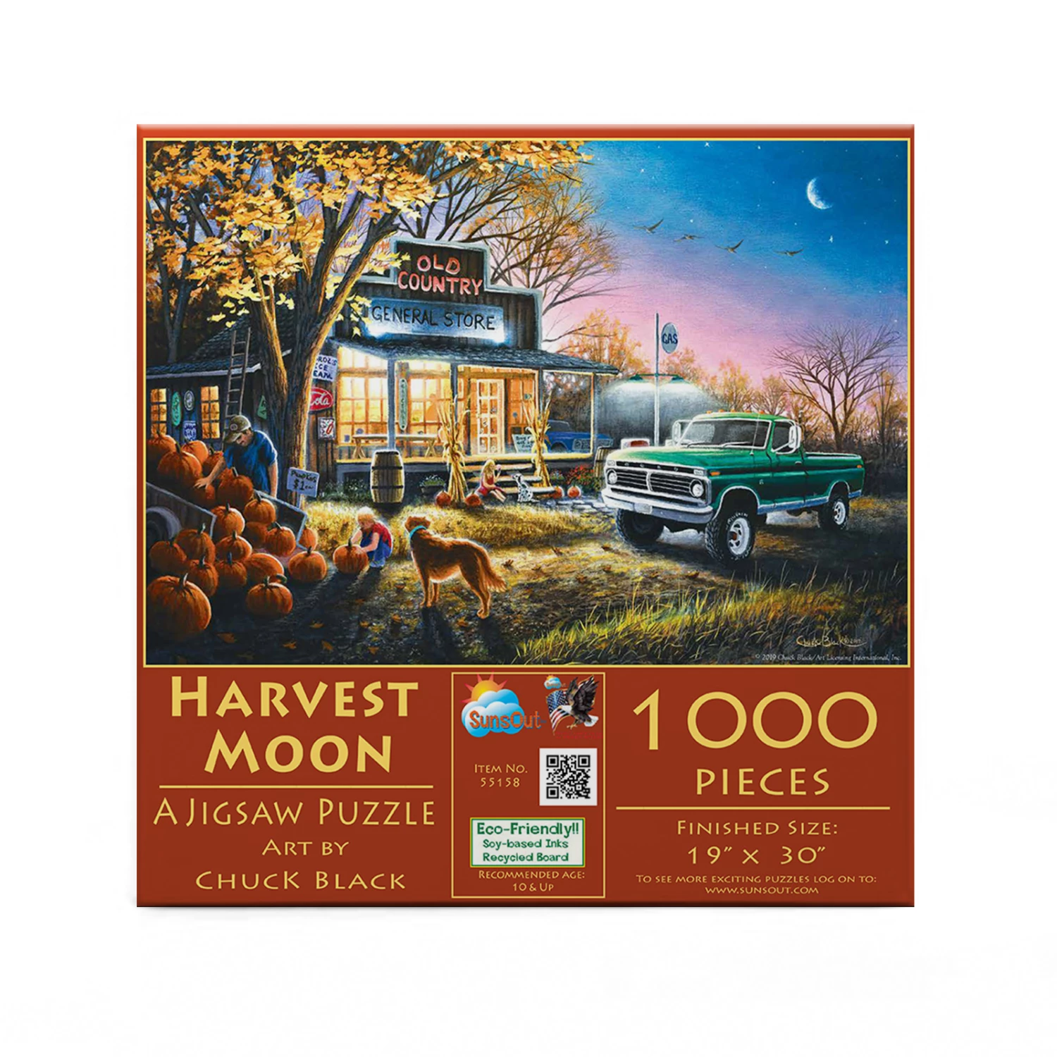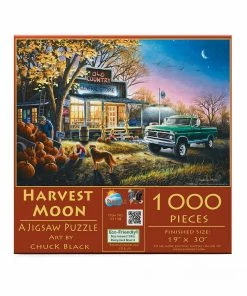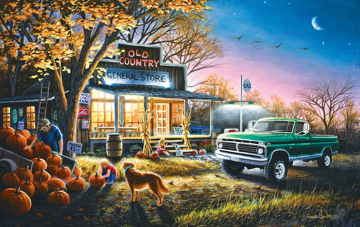 Halloween is coming soon in βHarvest Moonβ from SunsOut. A family is picking out the perfect pumpkin to carve outside the general store while a golden retriever looks on. The nostalgic autumn artwork is from Chuck Black. The completed 1000 piece puzzle will measure 30β x 19β.Β