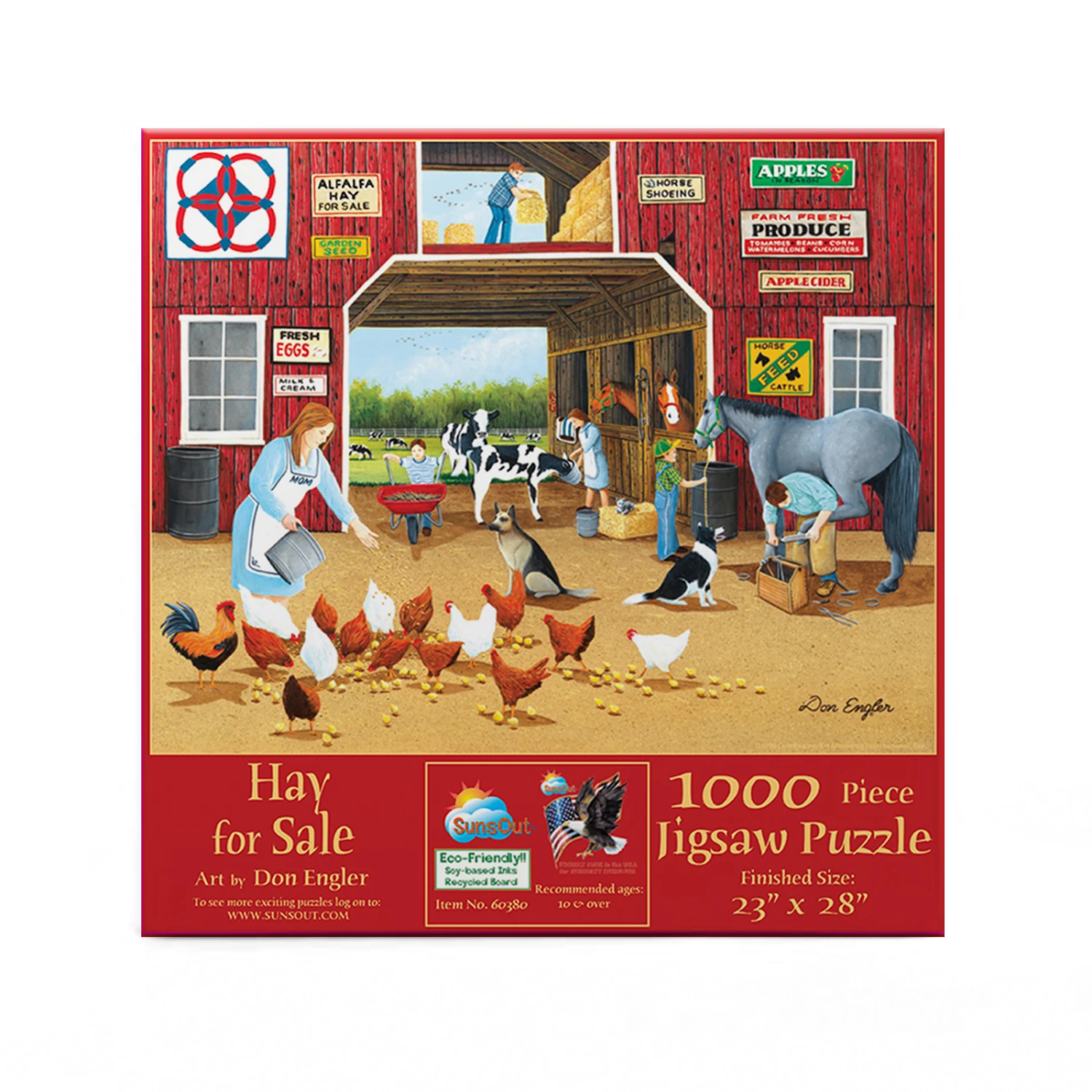 Pick up hay, apples, fresh eggs, seed, and horse feed at the barn in βHay for Saleβ from SunsOut. With chickens, cows, horses, and dogs, this puzzle has a lot of fun things to piece together. The colorful image from Don Engler makes a perfect puzzle with the perfect amount of challenge and easy sections. The completed 1000 piece jigsaw puzzle will measure 28β x 23β.Β
