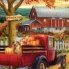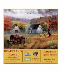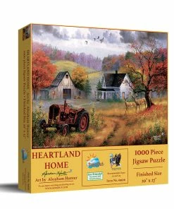 Deer scurry across the farmyard in βHeartland Homeβ from SunsOut. Artist Abraham Hunter has painted a beautiful autumn day complete with fall foliage, birds, and a big red tractor. The completed 1000 piece puzzle will measure 27β x 20β.Β