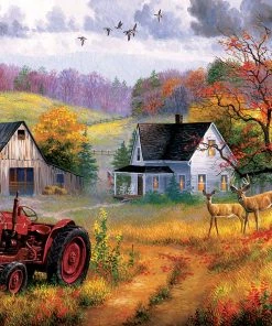 Deer scurry across the farmyard in βHeartland Homeβ from SunsOut. Artist Abraham Hunter has painted a beautiful autumn day complete with fall foliage, birds, and a big red tractor. The completed 1000 piece puzzle will measure 27β x 20β.Β