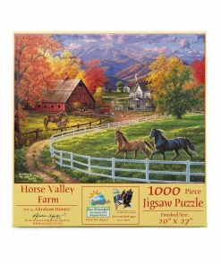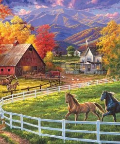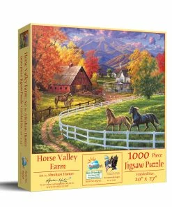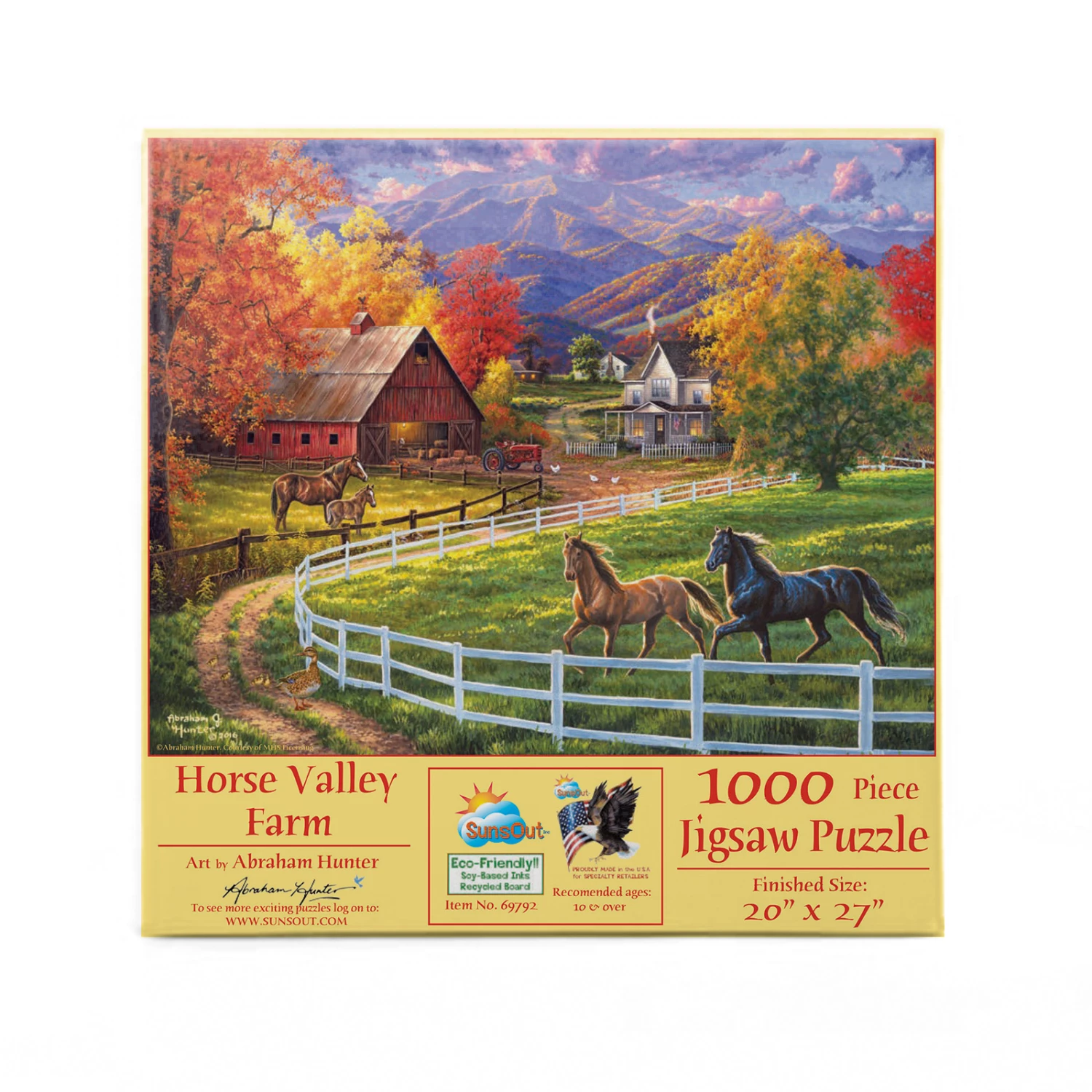 In this 1000 piece jigsaw puzzle from Sunsout, a pair of horses roam within the confines of this valley farm. Β Picture yourself in the beautiful autumn landscape as you assemble this puzzle. Artist Abraham Hunter has created a perfect fall scene for you to enjoy!Β