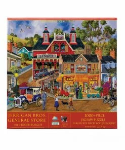 A bustling downtown scene is depicted in βJerrigan Bros General Storeβ from SunsOut. This colorful image was created by artist Joseph Burgess. The completed 1000 piece puzzle will measure 35β x 27β and features larger piece sizes for easy handling.