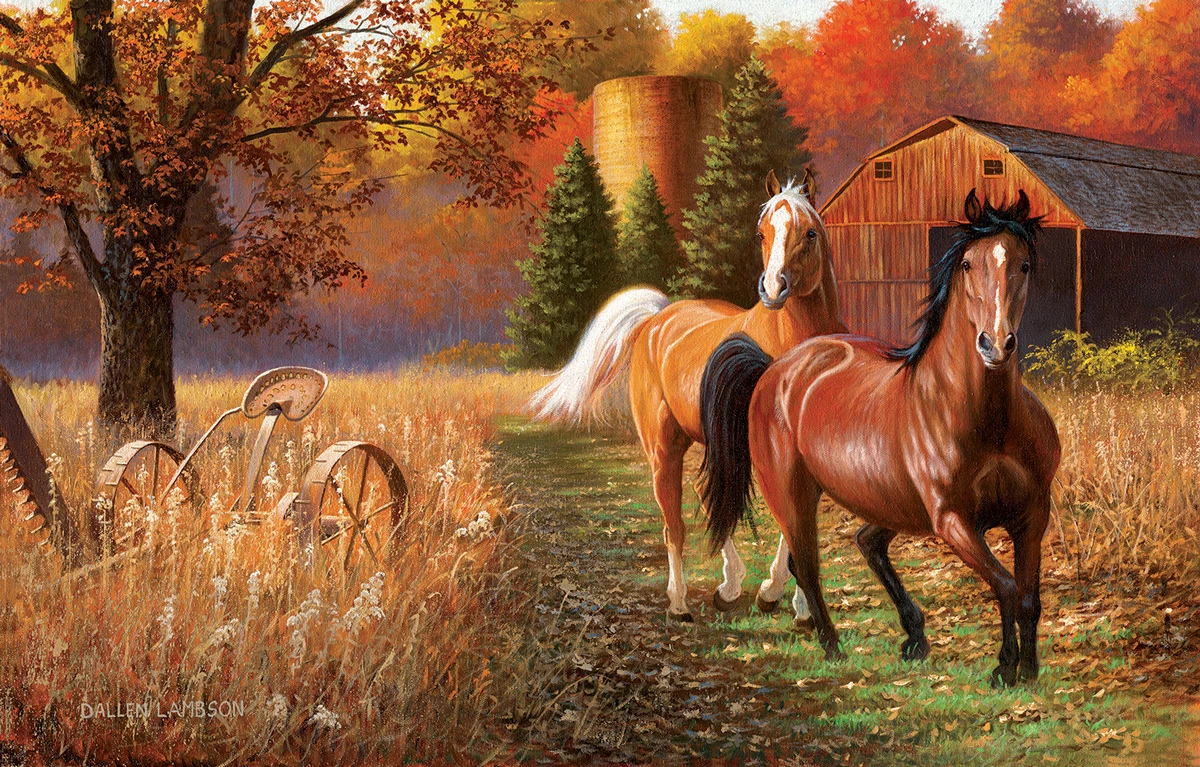 Two horses are running free in βOut for a Runβ from SunsOut. Featuring the detailed artwork of Lambsonβs Wildlife, this 1000 piece puzzle will be a hit with any horse lover. The fall colors will be a delight to piece together! The completed puzzle measures 30β x 19β.