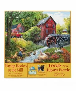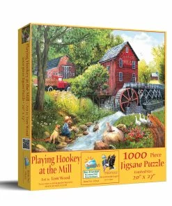 Playing Hookey at the Mill is a gorgeous 1000 piece jigsaw puzzle from Sunsout Inc. This quaint image features a young boy enjoying his day off fishing in the stream by the mill, with a beautifully lush green background. This image will present a fun challenge due to color, and is sure to be enjoyed by many!