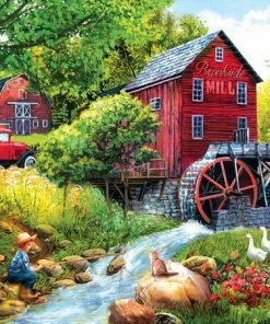 Playing Hookey at the Mill is a gorgeous 1000 piece jigsaw puzzle from Sunsout Inc. This quaint image features a young boy enjoying his day off fishing in the stream by the mill, with a beautifully lush green background. This image will present a fun challenge due to color, and is sure to be enjoyed by many!