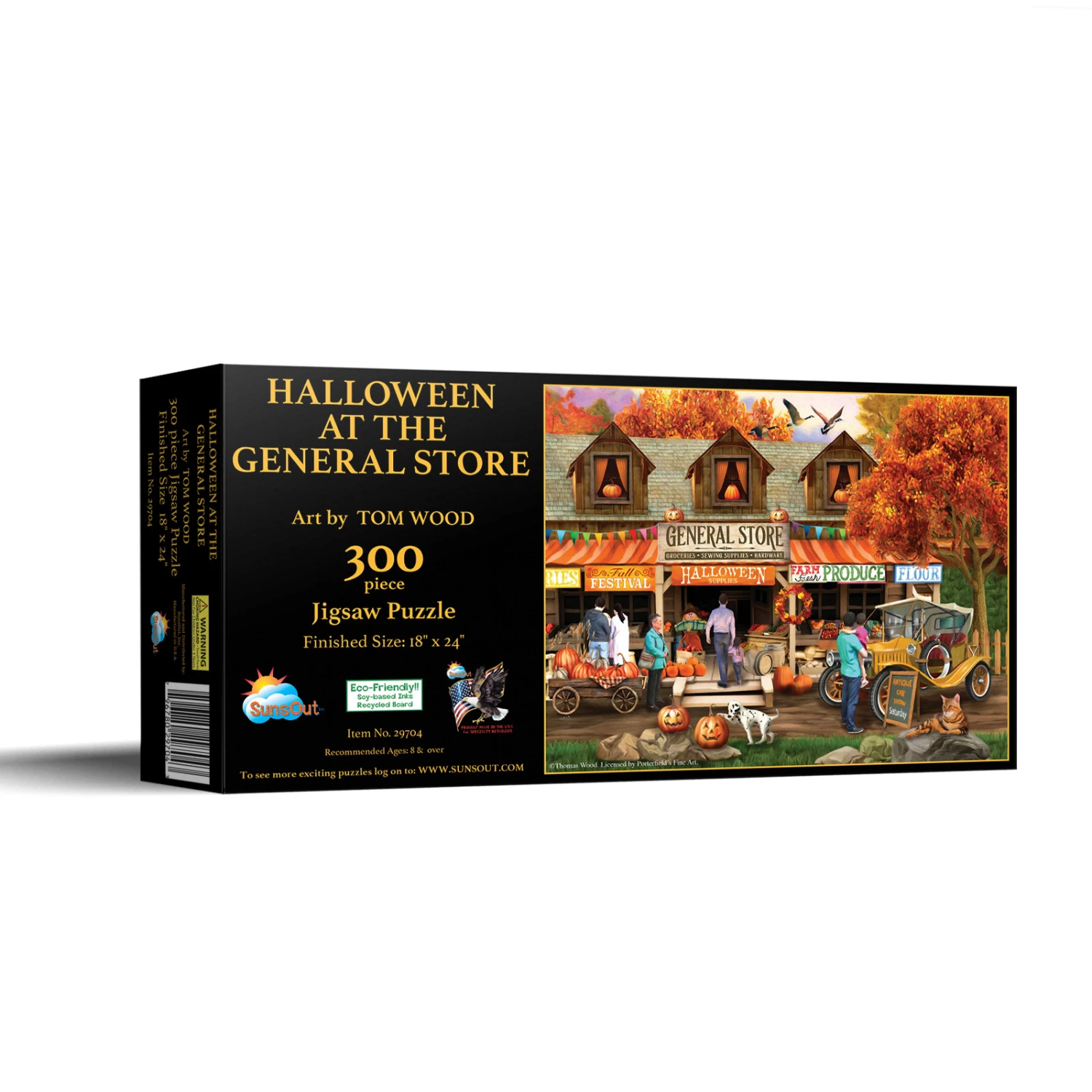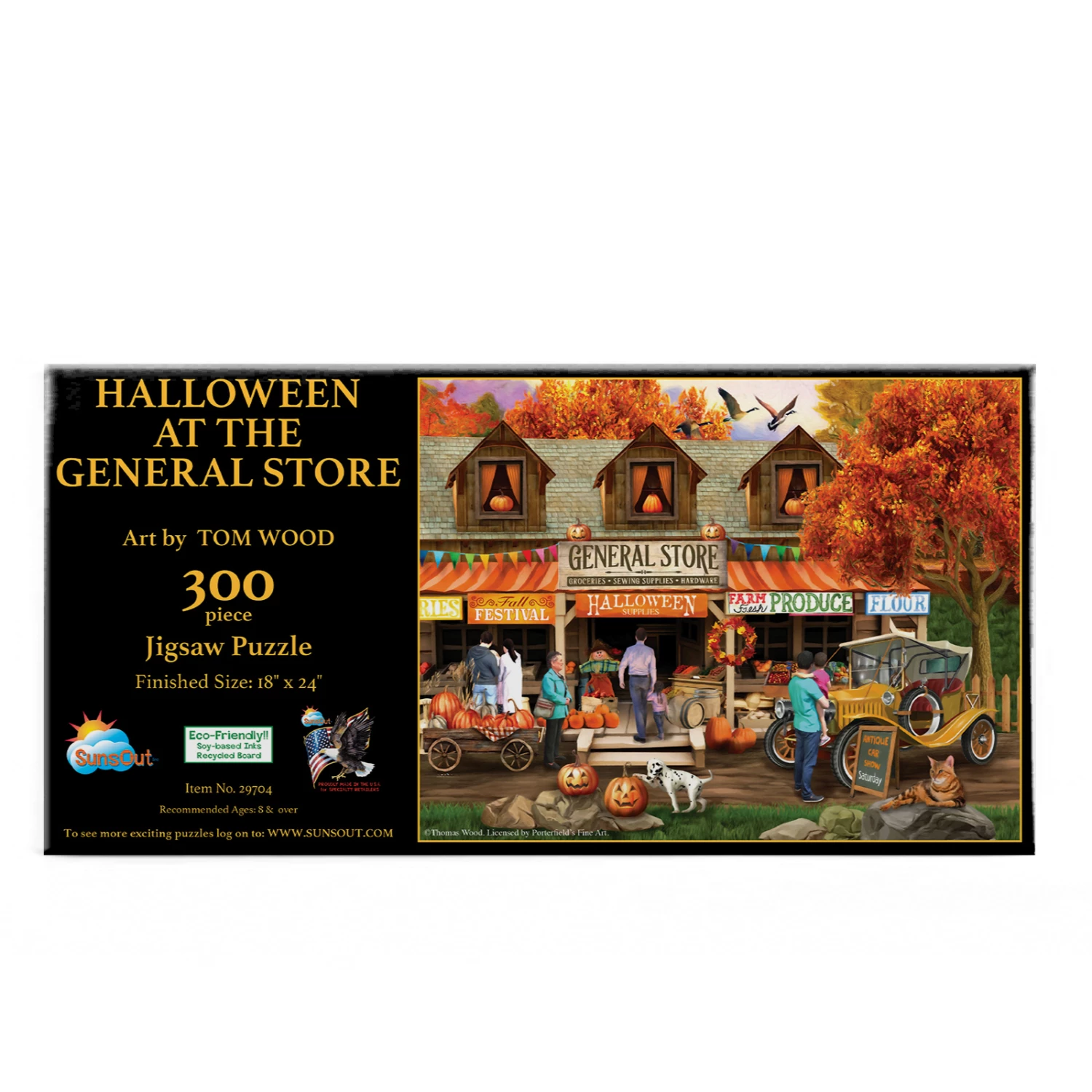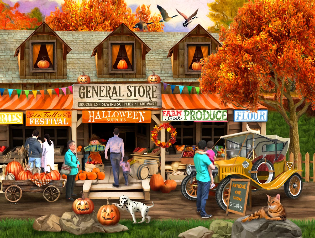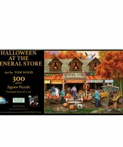 Get ready for spooky season with βHalloween at the General Storeβ from SunsOut. Featuring the artwork of Tom Wood, this bright colored puzzle will be a fun one to piece together. The fall foliage and pumpkins are really festive! The completed 300 piece puzzle will measure 24β x 18β and would be great to do with the whole family.