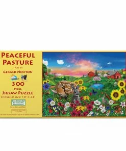 A fawn curls up in a field of flowers for the night while rabbits hop around near by. This fun farm scene would be perfect to do with family around Easter time. Artist Gerald Newton has created a bright and colorful scene that will appeal to puzzlers of all ages. The completed 300 piece puzzle will measure 24” x 18”.