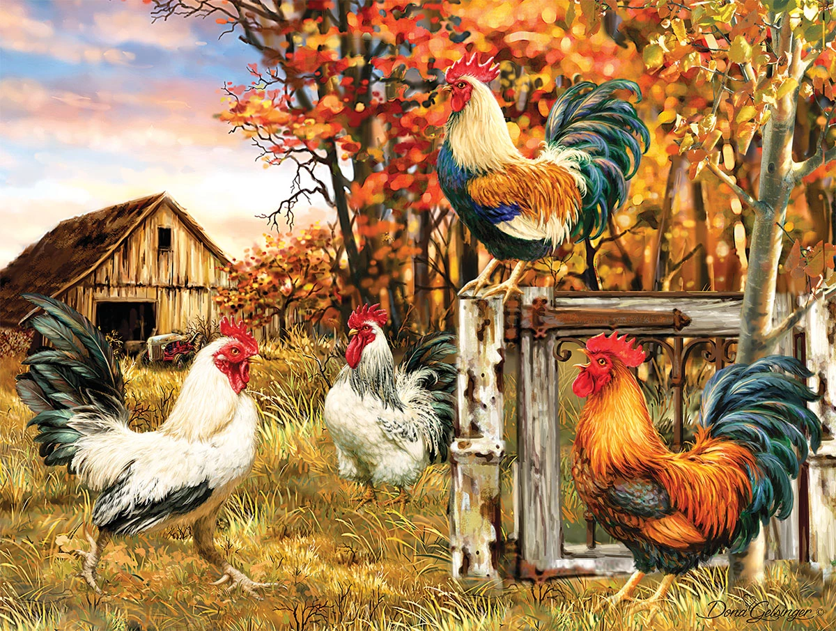 Four roosters are enjoying an autumn day on the farm in this 300 piece puzzle. The detailed artwork from Dona Gelsinger provides a fun challenge for puzzlers of all levels. This puzzle will measure 18โ x 24โ when complete.ย
