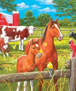 These barnyard friends are enjoying a day on the farm! A dog, cows, horses, and birds are all included in this fun image from William Vanderdasson. The completed 300 piece puzzle will measure 24โ x 18โ when completed.
