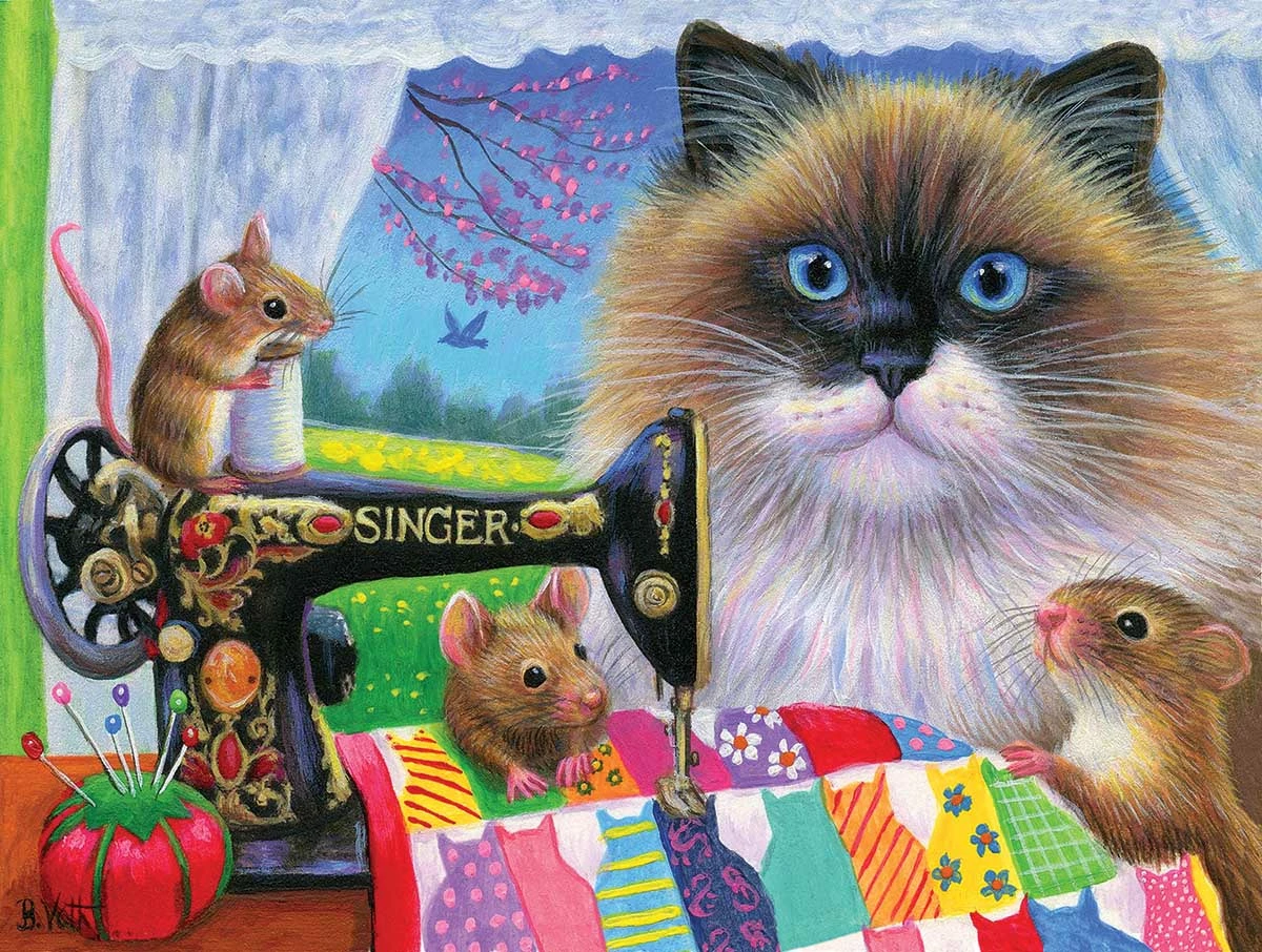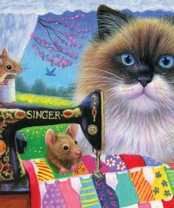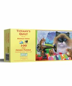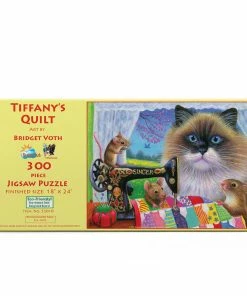 Three mice are helping a cat make a quilt in βTiffanyβs Quiltβ from SunsOut. The bright quilt features little patterned cats. The mice are working hard to make sure the quilt gets finished! This would be a great puzzle to do with children. The completed 300 piece puzzle will measure 24β x 18β.