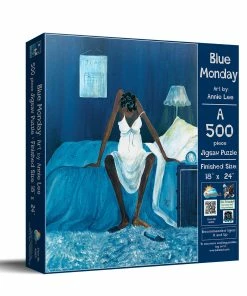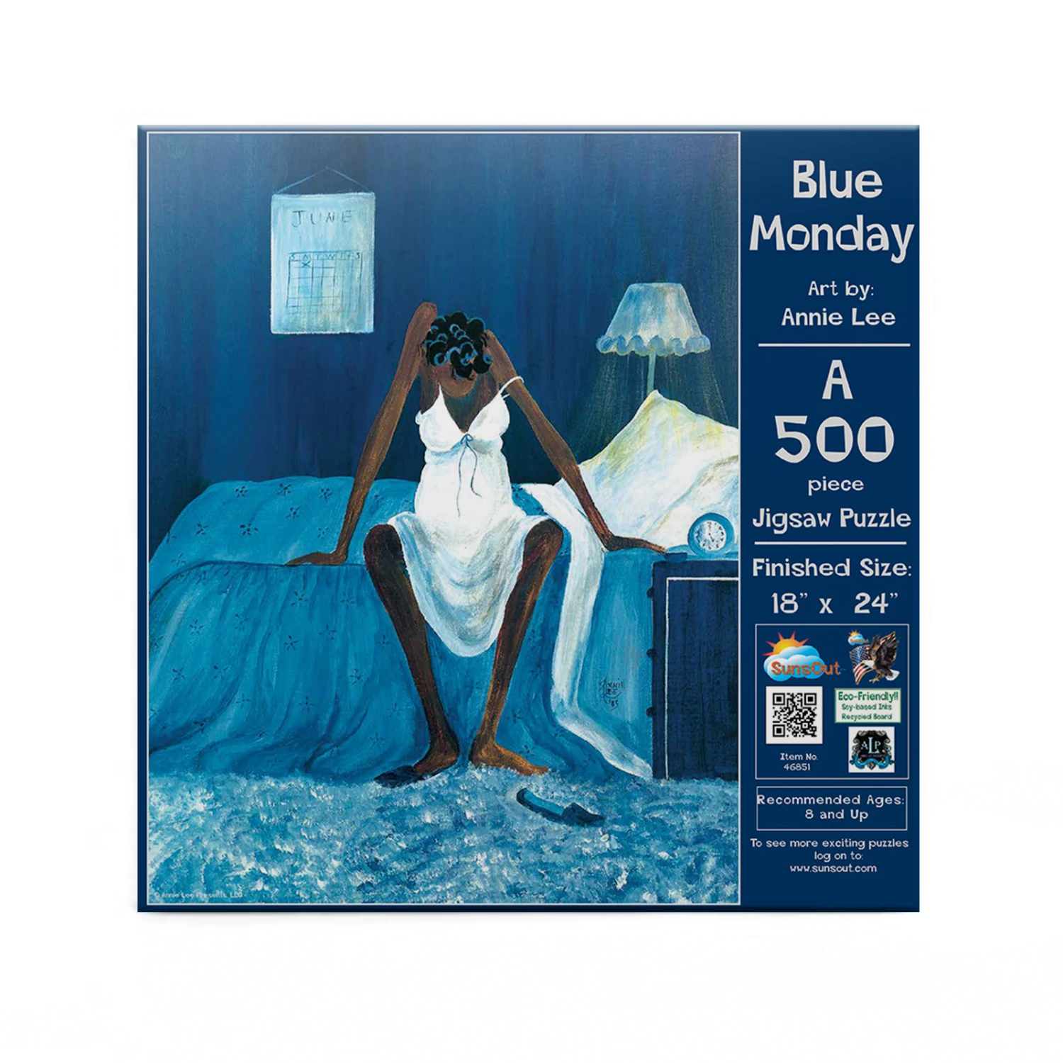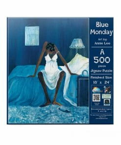 In the 500 piece jigsaw puzzle, Blue Monday by SunsOut, an illustration of a black woman is depicted as she sits at the edge of a bed dressed in a white night gown. The artist, Annie Lee, colored this illustration in blue and made it very detailed. This 10+ puzzle has dimensions of 18″ x 24″ (46 x 61 cm) which makes this a fun and challenging activity to do with the entire familyβespecially if you enjoy domestic themes.