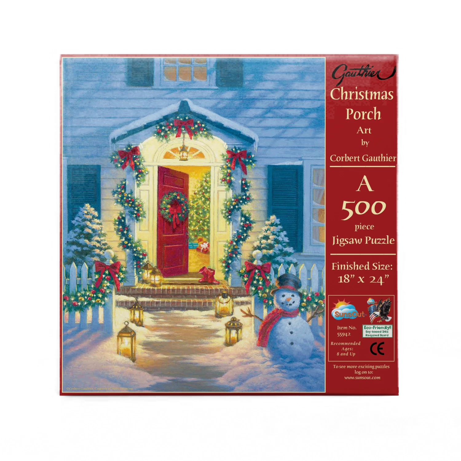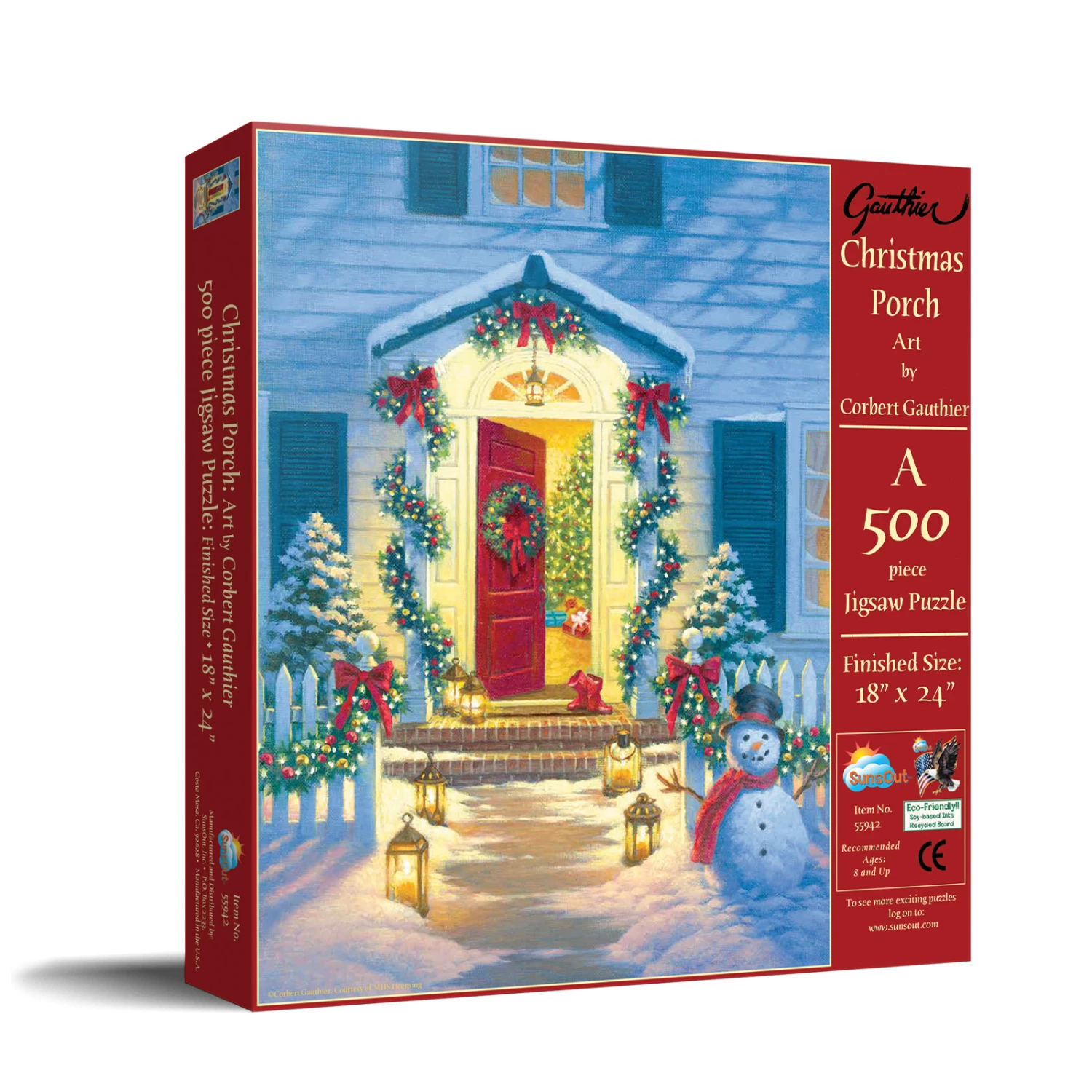 Open the door to the perfect Christmas Eve in SunsOutβs βChristmas Porchβ. This welcoming holiday scene features lots of snow and festive decorations. The 500 piece puzzle contains artwork from Corbert Gauthier. The completed puzzle will measure 18β x 24β.Β
