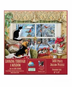 If you love animals and winter, this puzzle is made for you! Join a group of pets observing wild animals through their holiday decorated window. A raccoon, deer, cardinals, chickadee and snowman are looking back at the cats and dogs in the house. This fun image from Lori Schory is produced by SunsOut. The 500 piece puzzle will measure 24” x 18”.