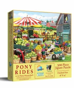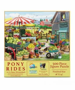 Pick up fresh produce and ride a pony at this fun farmerβs market! Artist Nancy Wernersbachβs image is vibrant and eye-catching. There are tons of fun elements to work on such as the baskets of produce, the striped umbrella, and the adorable chickens. The completed 500 piece puzzle will measure 24β x 18β.Β