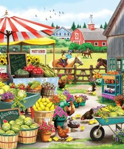 Pick up fresh produce and ride a pony at this fun farmerβs market! Artist Nancy Wernersbachβs image is vibrant and eye-catching. There are tons of fun elements to work on such as the baskets of produce, the striped umbrella, and the adorable chickens. The completed 500 piece puzzle will measure 24β x 18β.Β