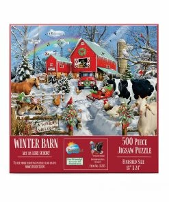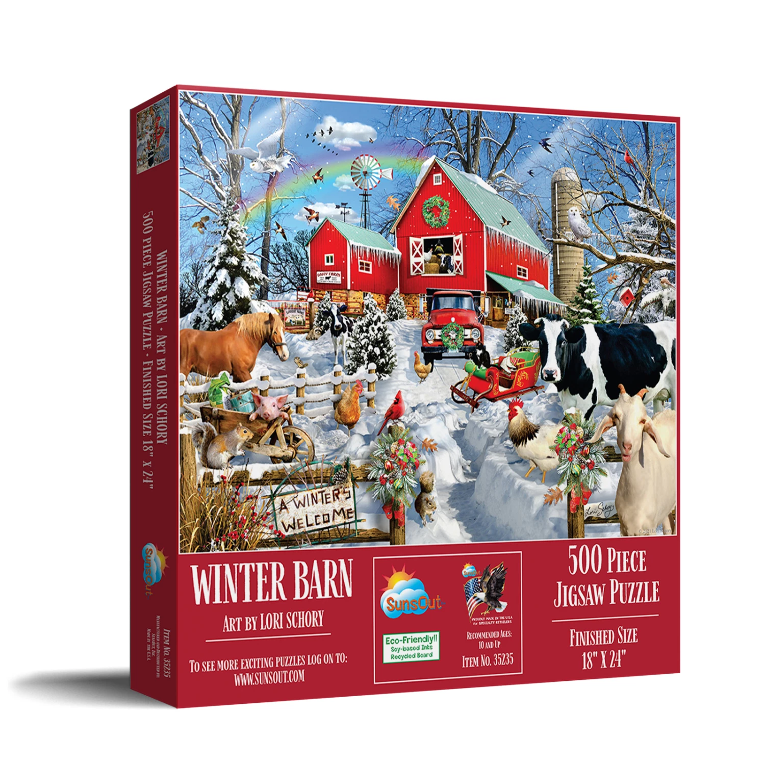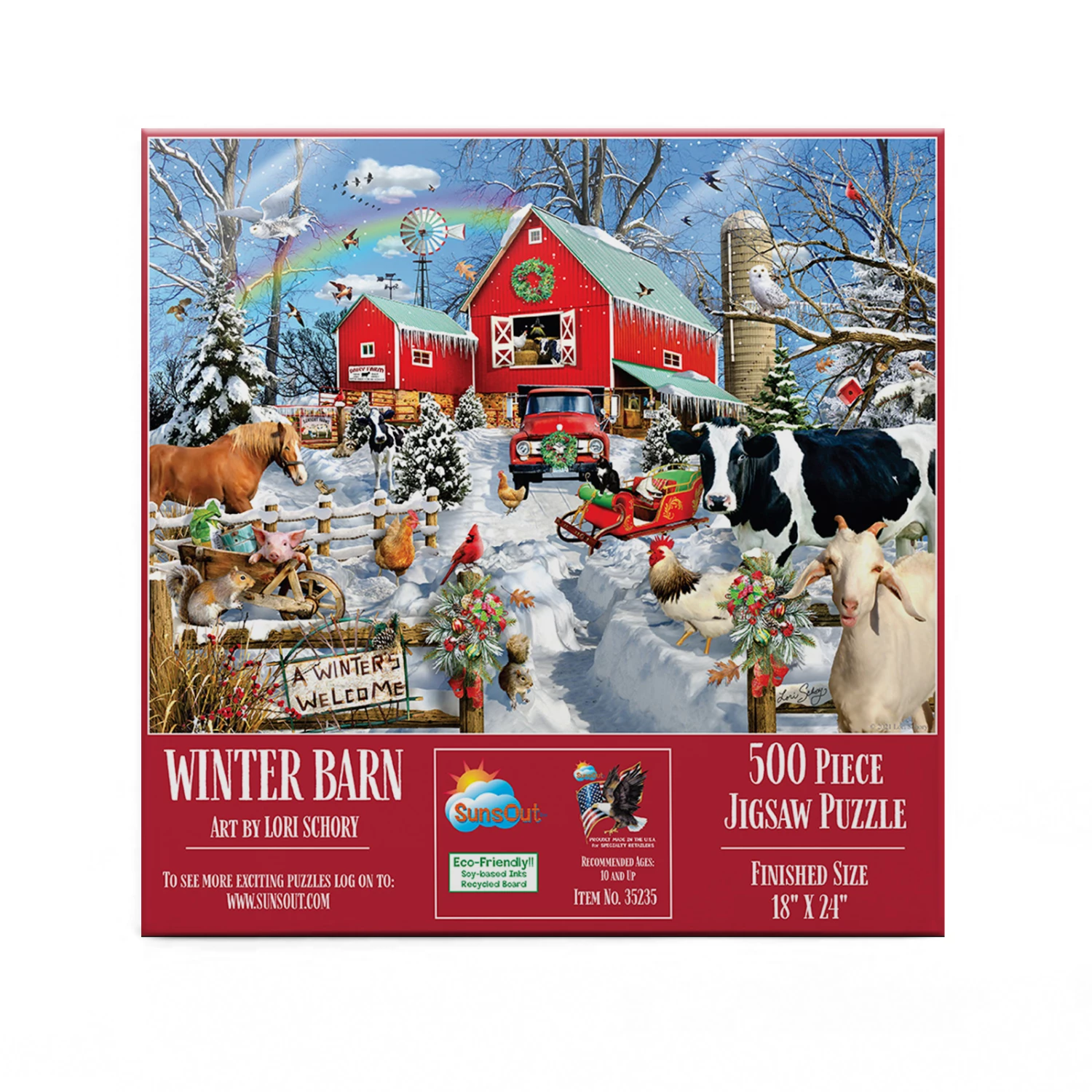 A group of barnyard animals are enjoying a snowy day on the farm. From chickens to goats to horses to cows, this puzzle has all your favorite barnyard animals! Artist Lori Schory has created a perfect winter wonderland image that will get you in the holiday spirit. The completed 500 piece puzzle will measure 24″ x 18″.