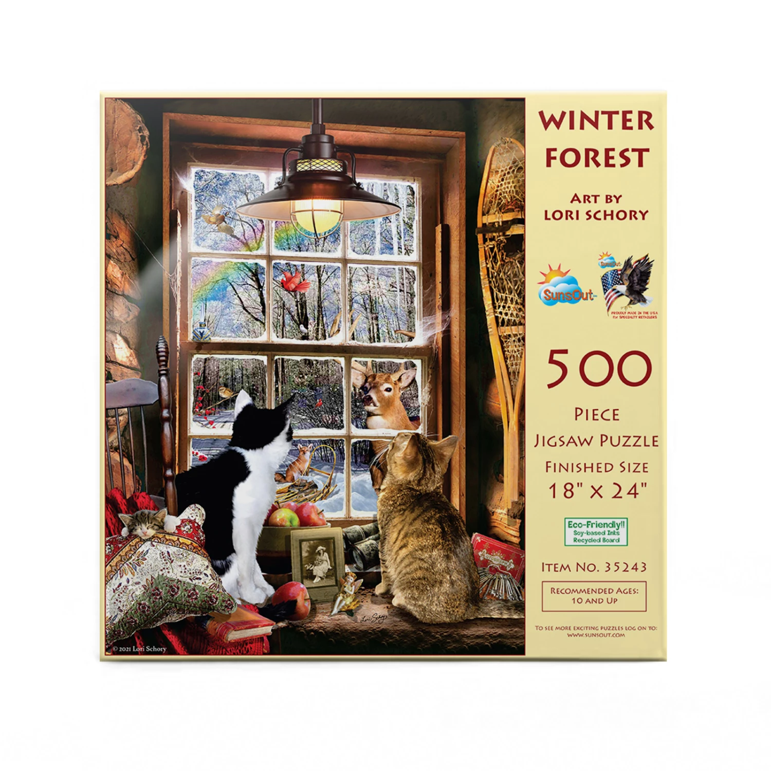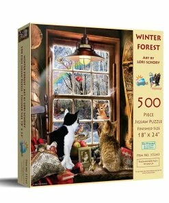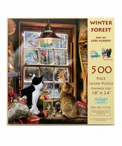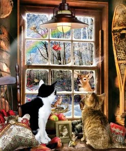 Inside a warm house, two cats are looking out into the woods. The deer and fox are enjoying the weather outside as a cardinal flies overhead. Artist Lori Schory added a lot of small details to this puzzle that you will enjoy finding as you piece together this wintery scene. The completed 500 piece puzzle will measure 18” x 24”. This puzzle was released in 2021.