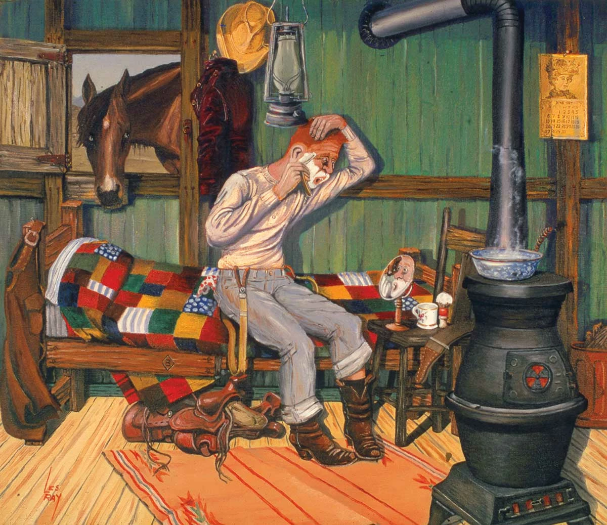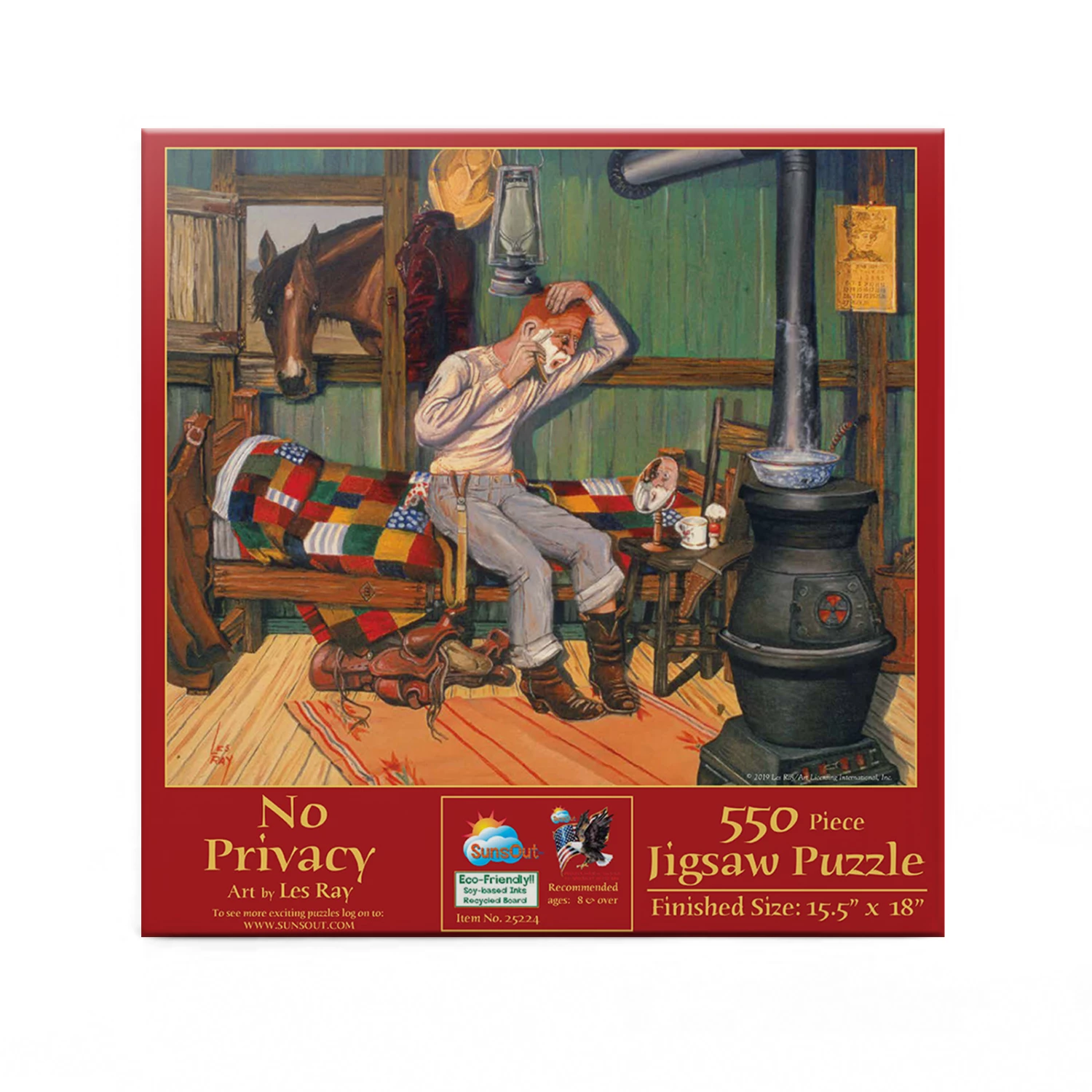 This scene might make you chuckle as you piece it together. ย A man gets a scare while shaving when his horse sneaks a peek through the window! Artist Les Ray has crafted this funny scene that is perfect for the whole family to put together. The completed 550 piece puzzle will measure 18โ x 15.5โ.